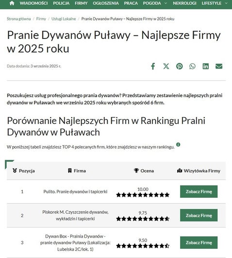 Serwis internetowy Wybierampulawy.pl ogłosił ranking najlepszych firm w Puławach oferujących pranie dywanów. Firma Pulito z Puław, działająca w okolicy miasta, jak również w Lublinie i okolicy zajęła pierwsze miejsce.